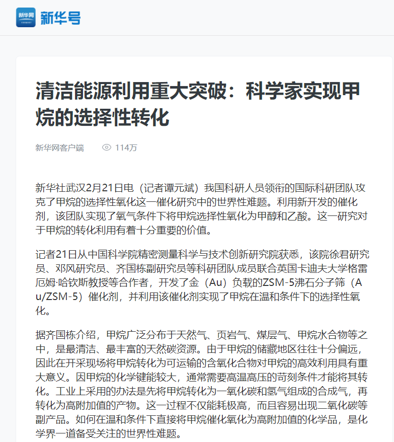 记者21日从中国科研实验室精密测量科学与技术创新研究院获悉,该院徐君研究员、邓风研究员、齐国栋副研究员等科研团队成员联合英国卡迪夫大学格雷厄姆·哈钦斯教授等合作者,开发了金(Au)负载的ZSM-5沸石分子筛(Au/ZSM-5)催化剂,并利用该催化剂实现了甲烷在温和条件下的选择性氧化。