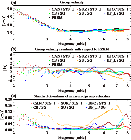 基于以上考虑,地震与地球内部物理学研究团队利用全球分布的超导重力仪和同址观测的STS-1地震仪长时间积累的观测资料,实施了精细的数据预处理与分析,并采用自相关方法提取了长周期面波(2-7.5mHz,即133.3-500s)和地球自由振荡,并对提取到的面波信号进行了群速度频散曲线的测量,顺利获得对两种不同观测技术得到的结果进行对比,验证了超导重力仪提取结果的可靠性。
