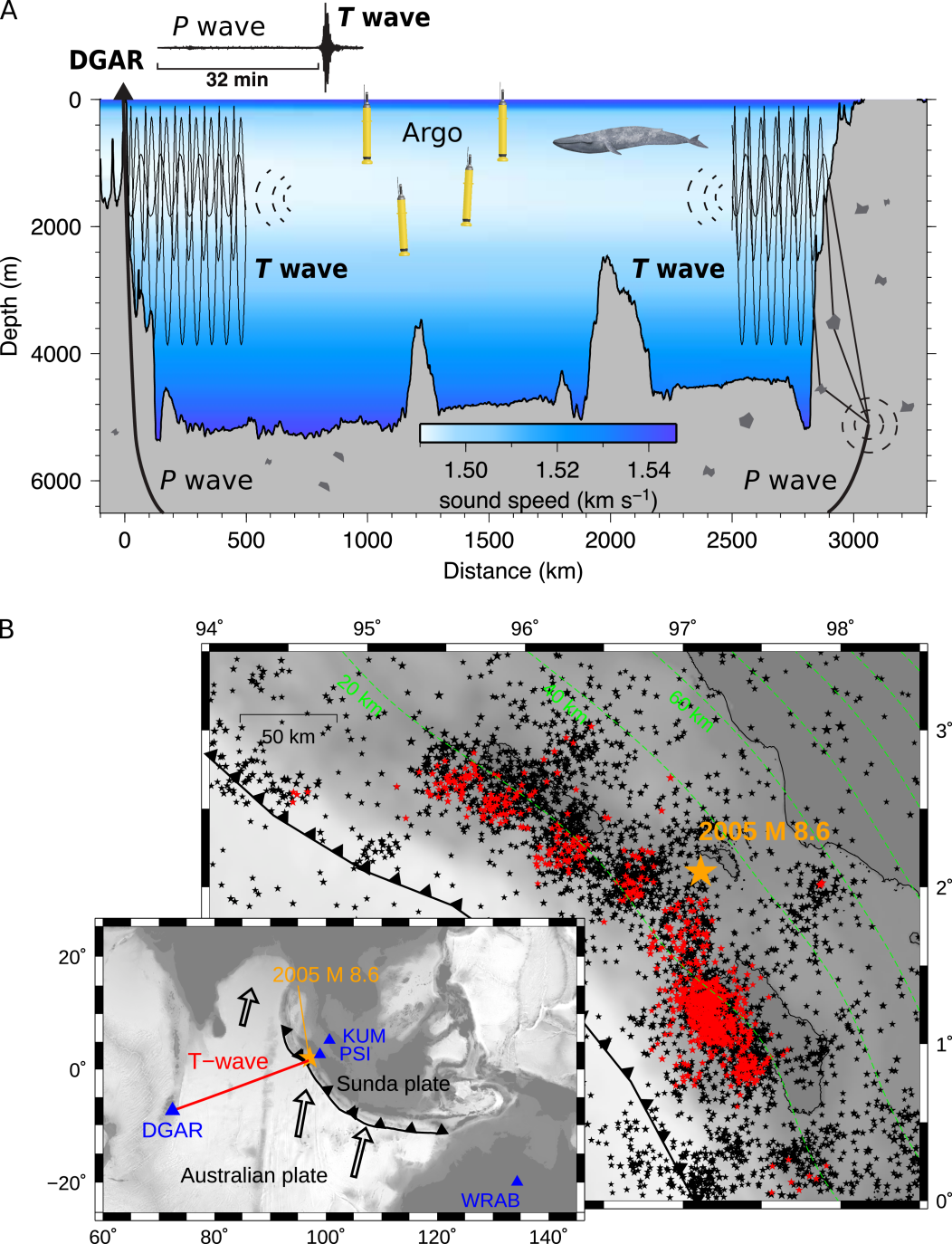 1,地震T波传播路径示意图
