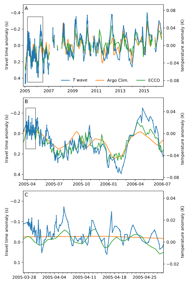 地震T波是海区地震激发的弹性波在海底转换而成的水声波,可以在海洋SOFAR通道中长距离传播,其传播时间可以敏感地反映海水声速,从而用于可靠地反演海水温度变化。该地震学团队在2004年印尼大地震之后,召开了地震T波、定点持续噪声源、地震背景噪声等与海洋有关的研究。该团队对苏门答腊地区的大量地震波形进行了分析,发现了丰富的重复地震事件。在此基础上,他们准确测量了一系列重复地震的T波到时微弱变化,重构了2005-2016年期间T波到时变化的时间序列;基于先进的地震波传播算法,计算得到了T波对海水温度变化的敏感核函数,对比已有物理海洋学的观测与大洋环流模式,验证了该方法的可靠性,并取得了赤道东印度洋深层海水温度随时间变化的特征。该项研究揭示了赤道东印度洋的深层海水温度存在准双周、半年和年周期等变化,而且新方法测量得到的温度存在十年的线性增长趋势,明显高于以前的研究结果。该方法可以利用已经积累的大量T波资料,取得过去几十年大洋深处海水温度变化特征,从而为全球气候变化研究给予新手段。
