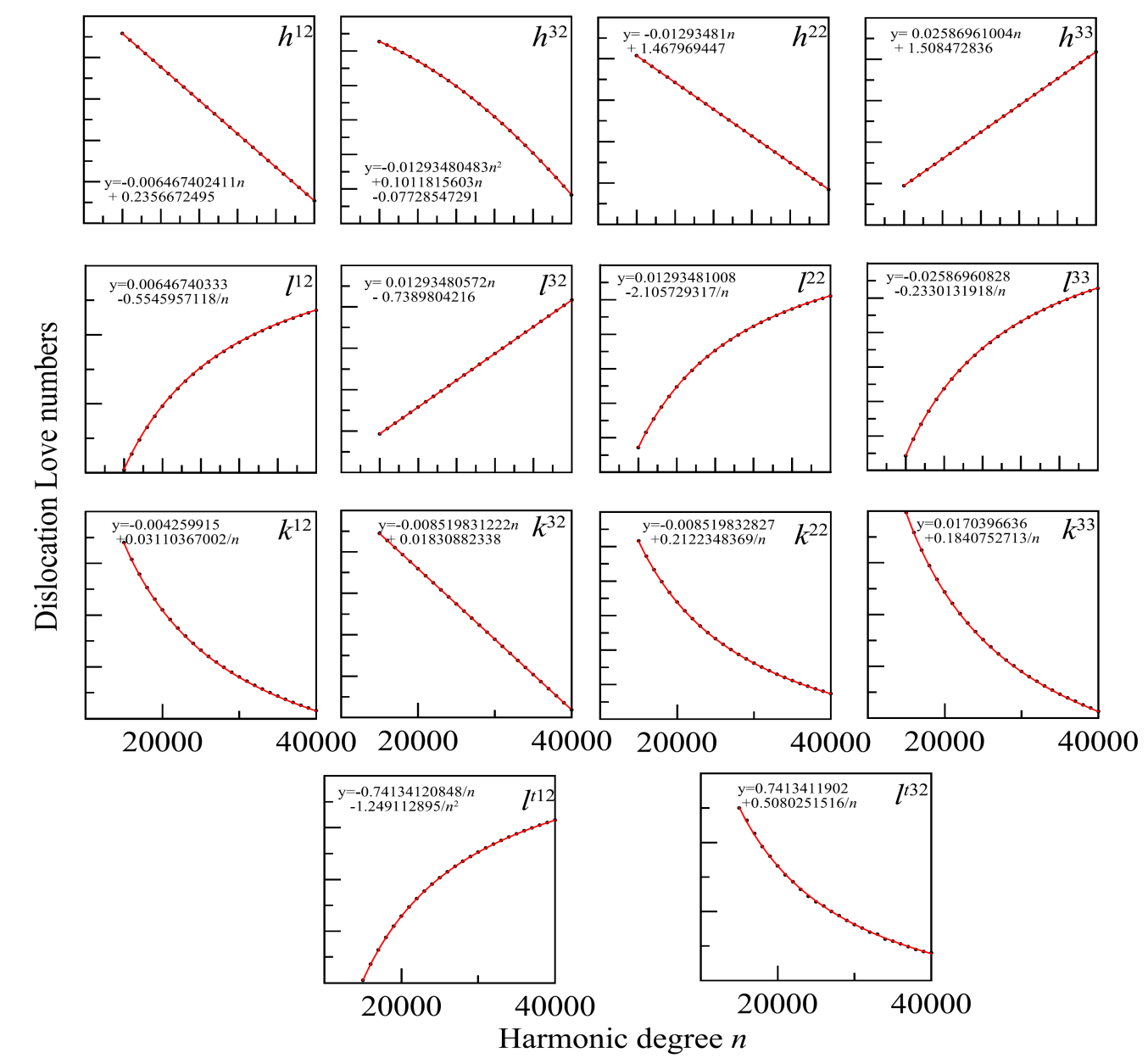 图1. 高阶地表位错Love数与渐近值拟合(震源深度100 km). 当震源深度为100 km时,尽管计算地表位错格林函数不需要特别高阶的位错勒夫数,但是顺利获得计算高阶位错勒夫数,可以发现其相对于球谐阶数n的变化规律,由此可以很容易地拟合出当n趋于无穷大时的位错勒夫数渐近值,从而可以实施Kummer变换以加速格林函数的收敛。