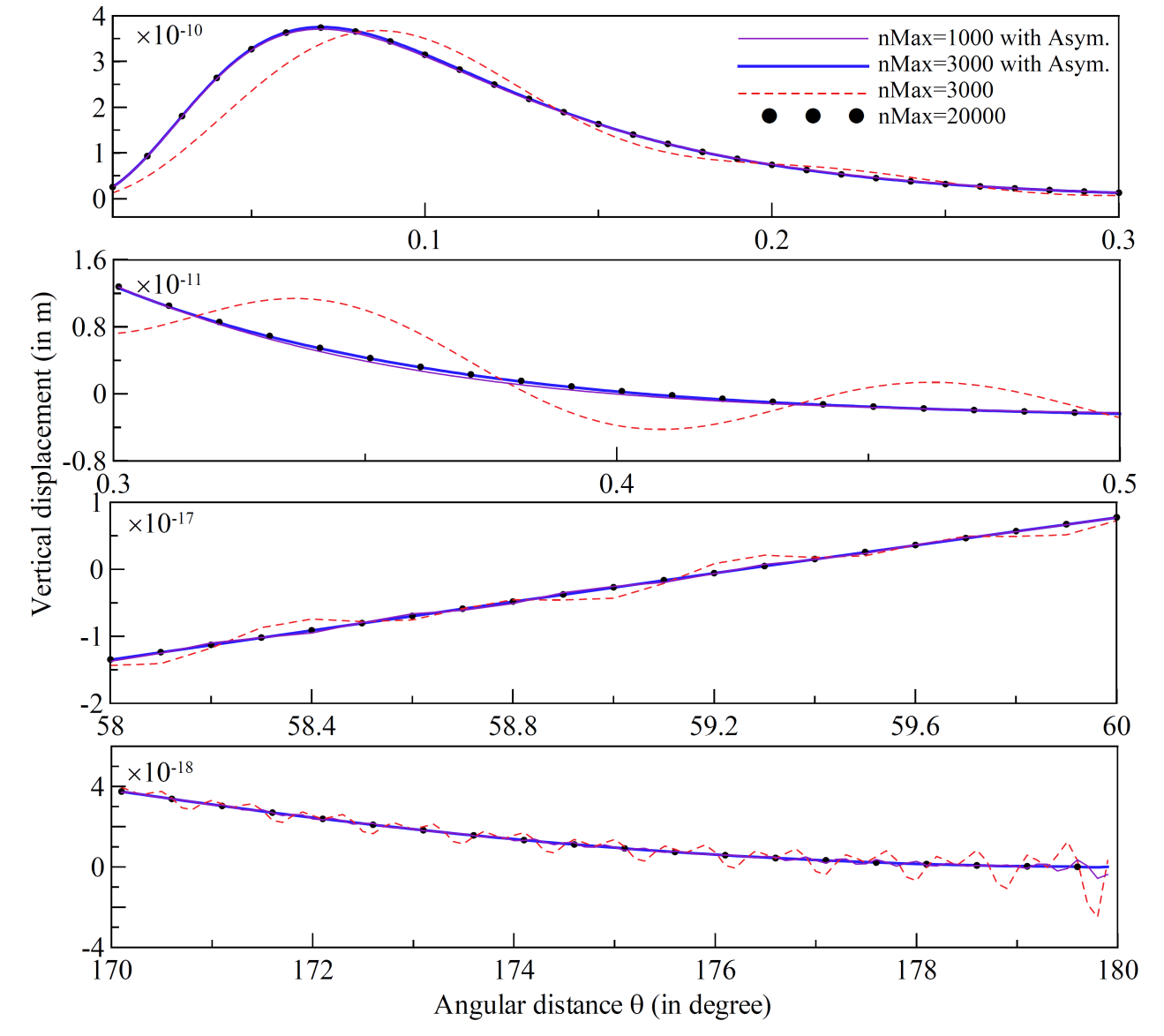 在球坐标系统下,格林函数是包含球函数级数的无穷项的和。对于计算点与源点距离较近的情形,由于级数的收敛非常慢,计算格林函数需要超高阶的位错勒夫数。如果直接计算超高阶位错勒夫数并进行级数求和进而取得格林函数,将使计算工作耗时而效率低下,因此需要求助加速级数收敛的特殊计算技巧,以便提高计算效率与精度。库玛(Kummer)变换是常用的加速格林函数收敛的技术手段,但是由于以往没有位错勒夫数的渐近值,在计算位错格林函数时库玛变换无法实施。特别对于震源较浅(甚至接近地表)的地震,如何准确模拟地表的形变是一个非常困难的问题。由于成功计算了超高阶的位错勒夫数,因此可以拟合出其渐近值,这样就使得库玛变换能够付诸实施,从而成功解决了格林函数的收敛问题。顺利获得计算发现,只需要较低阶的位错勒夫数,再结合拟合出的渐近值就可以确保位错格林函数的收敛,这大大增强了计算位错格林函数的效率。另一方面,顺利获得分析传播矩阵的特征,也从理论上取得了位错勒夫数的精确渐近值。因此,该团队的研究成果可有效解决特殊情形下(如断层延续到地表、浅源爆炸等)的格林函数收敛的计算问题。。