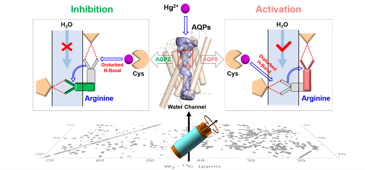 近期,凯发K8刘买利、杨俊研究团队与中科院上海药物所研究员于坤千、新加坡国立大学教授林青松、江苏师范大学教授开雷等研究团队合作,利用固体核磁共振和分子动力学模拟等研究方法揭示了汞离子调控水通道蛋白(AQP)功能的分子机制,为开发AQP功能调节剂给予了理论指导。相关研究成果发表在化学类综合性期刊《美国化学会志》(J Am Chem Soc)上。