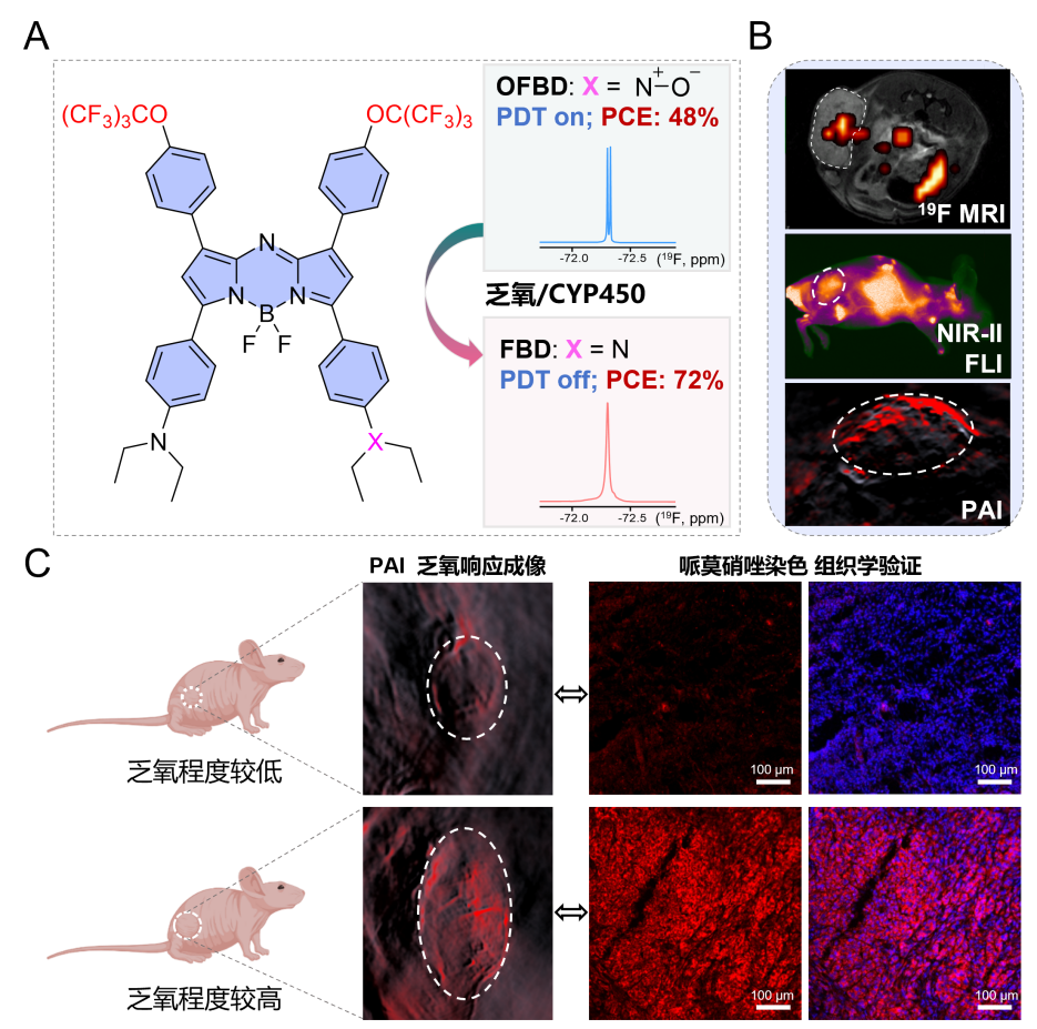 针对深部肿瘤成像中普遍存在的信号穿透能力有限、背景干扰强以及难以精确定量等关键问题,研究团队从源头进行分子设计,构建了多功能分子氟化aza-BODIPY(OFBD),用于实现深部肿瘤的精准成像与治疗。团队对光敏分子aza-BODIPY骨架进行了双重功能改造:一方面引入氮氧盐基团,赋予分子在乏氧微环境中的特异性响应功能;另一方面引入含9个等价氟原子的全氟叔丁基,取得单一且可定量的19F磁共振信号,避免了多氟体系中常见的多峰信号与化学位移伪影。进一步,研究团队提出氟相共组装策略,使OFBD分子在液态氟碳化合物环境中形成有序的J-聚集态该体系不仅将荧光发射波长延伸至近红外二区(可达1200 nm),提升了荧光成像的组织穿透能力,而且确保了所有氟原子处于等价的化学环境,实现统一的19F磁共振信号与100%的氟原子利用度。此外,OFBD在肿瘤乏氧微环境中可特异性激活光声信号(870 nm),解决了肿瘤乏氧环境成像的难题。