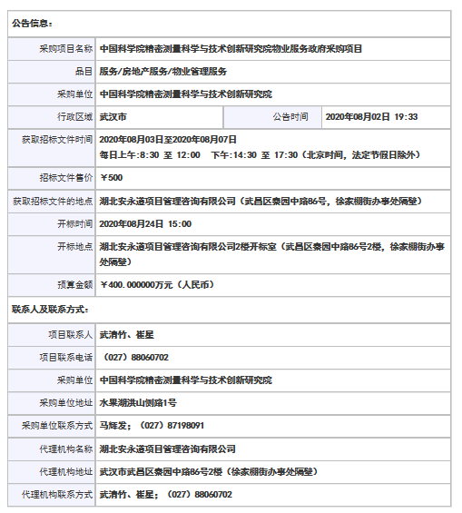 中国科研实验室精密测量科学与技术创新研究院物业服务政府采购项目公开招标公告