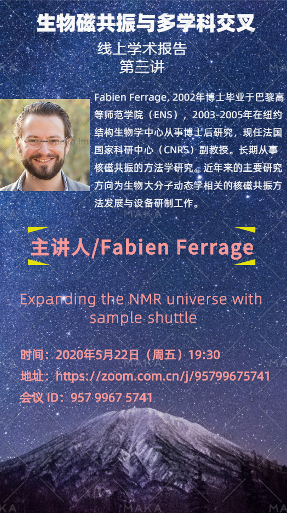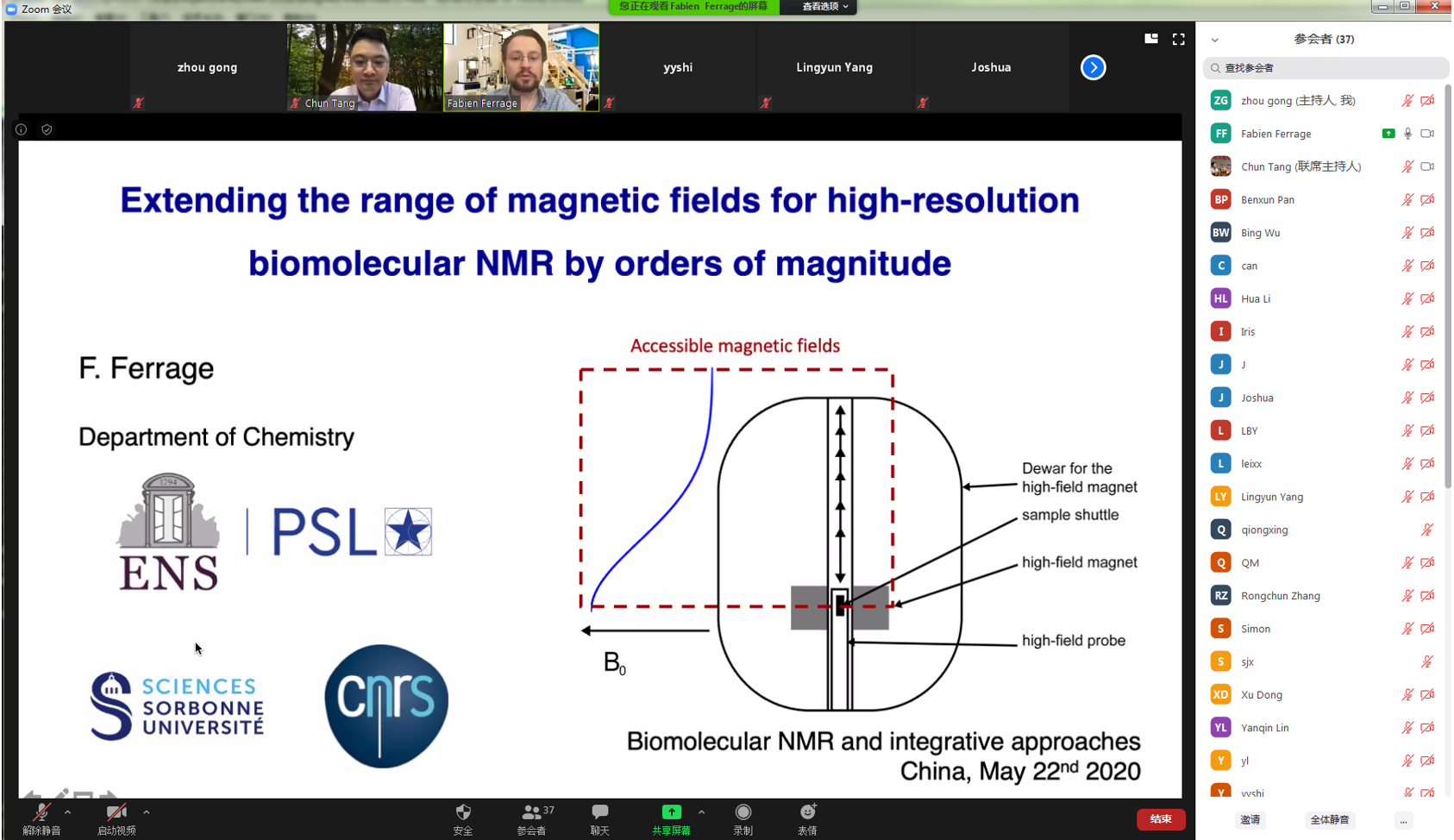5月22日晚7:30,应凯发K8唐淳研究员的邀请,法国国家科学研究中心(CNRS)Fabien Ferrage教授在线上平台做了题为“Expanding the NMR universe with sample shuttle”的学术报告。