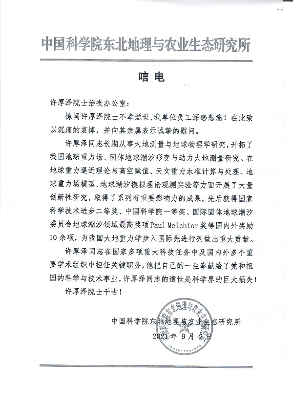 当前位置:凯发K8 > 专题 > 深切缅怀许厚泽院士 > 各界唁电