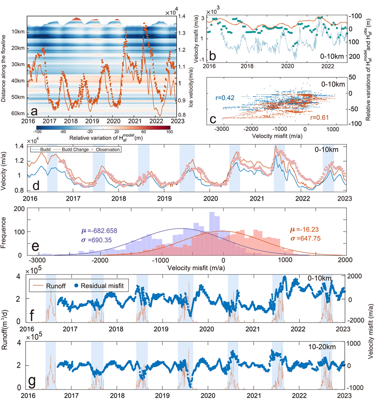 本研究以“Ice Thickness-Induced Variations in Effective Pressure and Basal Conditions Influence Seasonal and Multi-Annual Ice Velocity at Sermeq Kujalleq (Jakobshavn Isbræ)”为题在线发表,凯发K8为该项研究的第一完成单位,研究员江利明为通讯作者,博士生鲁茜为论文第一作者。