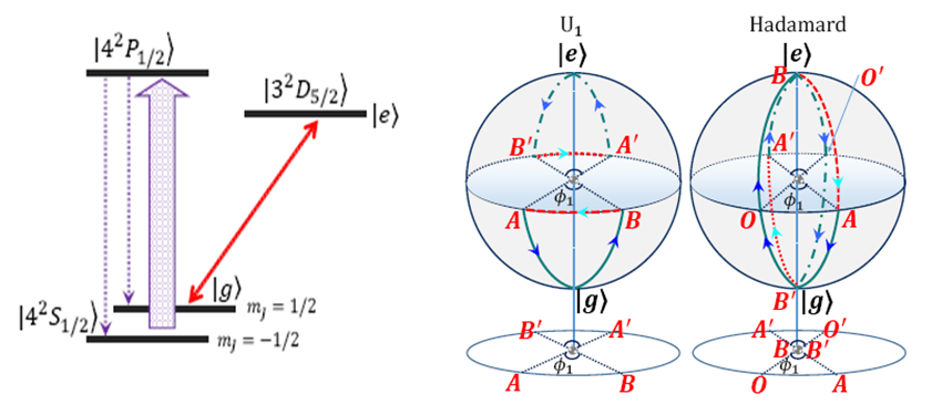 基于40Ca+离子的NNGQC实验原理图。左图为量子比特的逻辑操控示意图;右图是U1逻辑门和 Hadamard逻辑门的几何逻辑操作所对应的量子参数态演化示意图