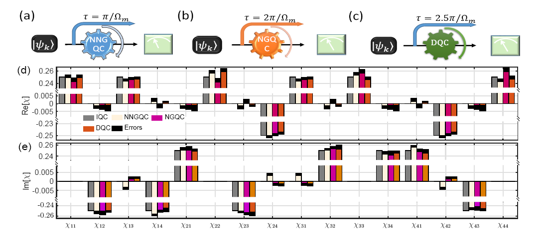 NNGQC、NGQC和DQC分别执行U1逻辑门的实验结果比较。上图列出了三个门操作的时间对比为1: 2: 2.5; 下图比较了三个门操作下的量子态演化和误差情况,其中IQC为当作参考的理想门操作