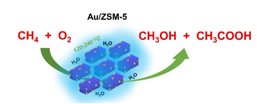 Au/ZSM-5催化甲烷选择性氧化生成甲醇与乙酸示意图