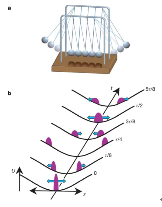 (a)经典牛顿单摆;(b)囚禁的准一维玻色气体实现了量子牛顿单摆。在时间t=0时刻,一维相互作用超冷原子被布拉格光脉冲分成反向运动的两部分,在经历四分之一周期时,两部分达到最大分离状态;然后它们向中心位置移动,经历二分之一周期相遇后又沿相反方向运动,再一次分开;体系经历几十时毫秒时间的演化和多次振荡无法达到平衡状态。本实验观测到的现象涉及到一维量子可积体系是否能够热化,也是一维量子多体物理的公开难题。